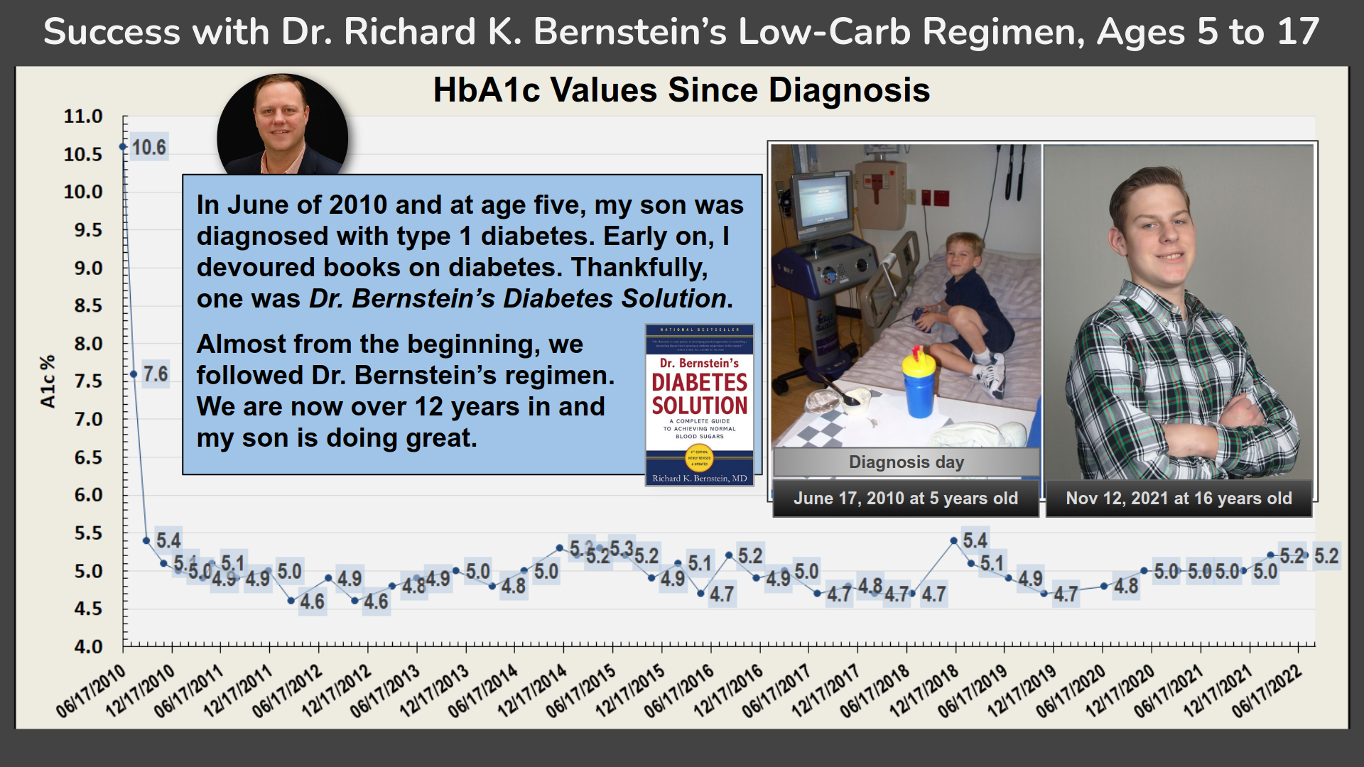 For more than a decade, my family has had remarkable success (click to see) using low-carbohydrate and high-protein dieting as a basis for successful diabetes management with my now teenage son. We follow the regimen described in the book Dr. Bernstein's Diabetes Solution (read for free at archive.org), and we are not alone. This page links to videos and social media resources from myself and others on the topic.