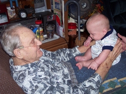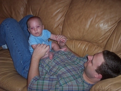 Dad and I play twice each day --in the morning before, and in the afternoon after, he goes to work. This shot is after work... Mom's probably in the kitchen wrapping up some "big people food" and making my bottle and num-num...