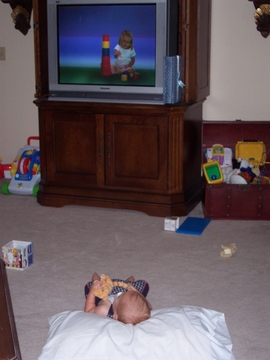 ![]() Tue Jun 6 16:11:27 2006 Andrew likes to watch his "Praise Baby" videos, and that is one of the very few activities that he will be still and quiet for. He even "asks" to have them turned on fairly often, by taking the remote control to the TV, pointing, and making baby noises. |