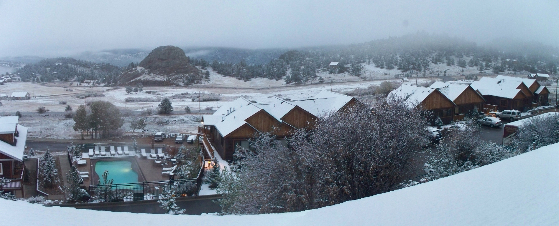 ![]() Fri 10 Oct 2008 08:37:43 PM A panoramic view outside our hotel room windows at Mary's Lake Lodge the morning we left. Note the early snowfall. |