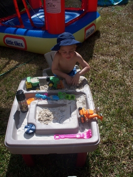 Andrew digging for dinosaurs in his sandbox. It's really funny to hear him try to say paleontologist.