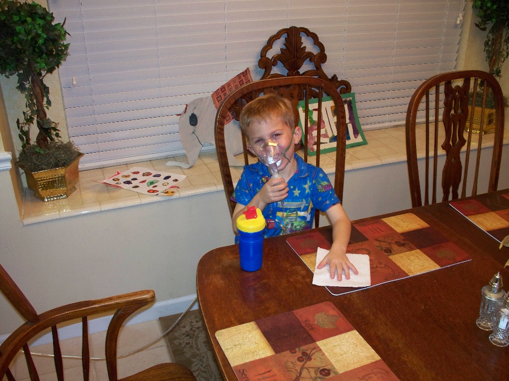 ![]() Sun 11 Apr 2010 08:13:01 PM Andrew got very sick, starting the night of Thursday, April 8th. On Friday evening he started exhibiting asthma symptoms for the first time. This is a photo of Andrew taking a nebulizer treatment to relieve asthma symptoms. |