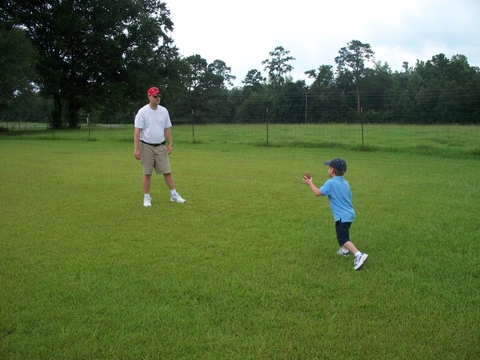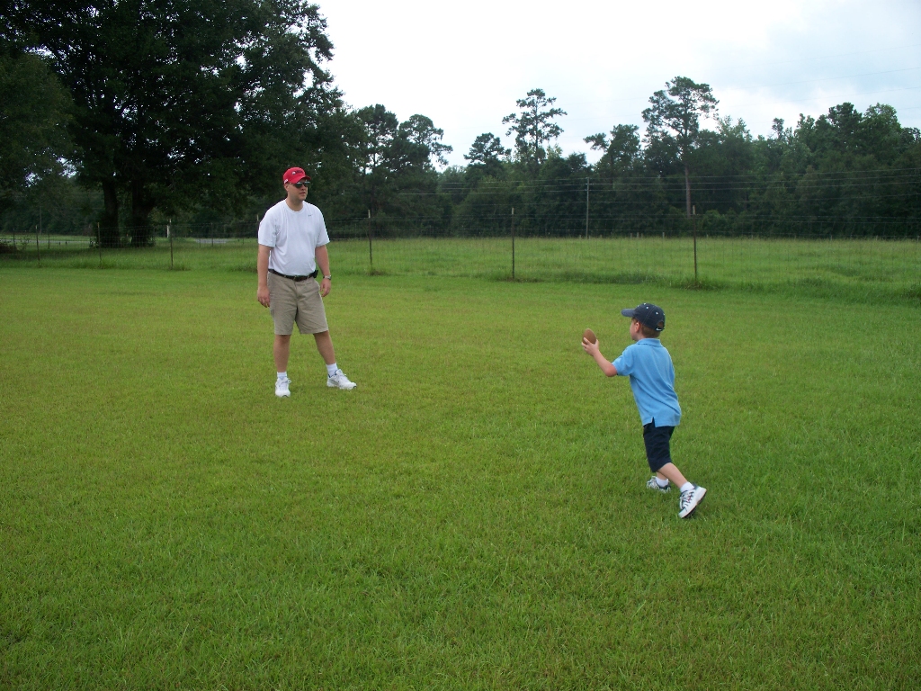 Andrew and dad toss a football at Grandaddy's house.
