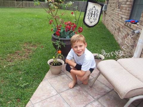 A small tomato that Andrew grew on the patio. He ate it the next day and said that it was great. He let Dad taste and he agreed!
