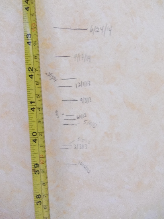 Album: Photo Gallery / Family Events, Outings, Vacations, etc. / 2014 Events / 07/01/2014, Growth marks from kitchen wall at 667 Fingal Drive